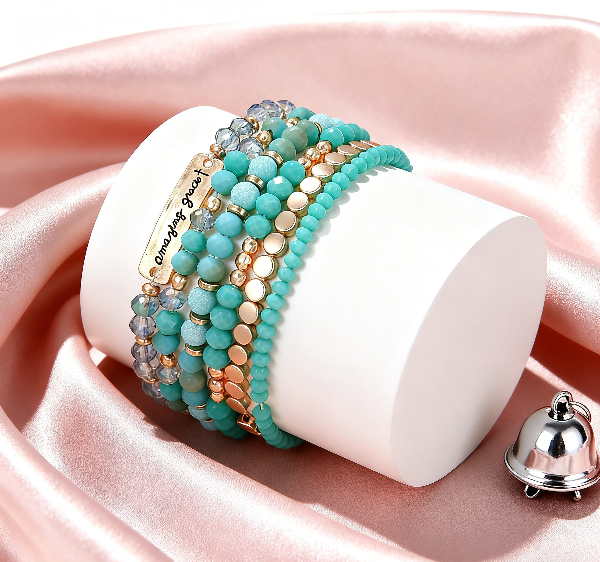 Inspired by the profound meaning of the classic hymn "Amazing Grace", this bracelet artfully interweaves various turquoise-hued beads with golden accents. The turquoise beads of different textures are as fresh and lively as a forest spring, while the golden elements add a touch of warmth and sophistication. The metal plate engraved with "amazing grace" is not only a design highlight but also carries the beautiful meanings of "grace, gratitude, and calmness". The multi-strand layered design is rich in texture, featuring both retro fashion and an implicit appreciation for life's gifts. More than just an accessory, it is a spiritual comfort to carry with you. May you, who wear it, be surrounded by grace at all times and embrace every moment of beauty with a calm demeanor.