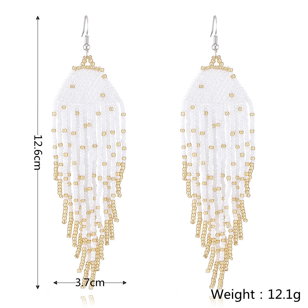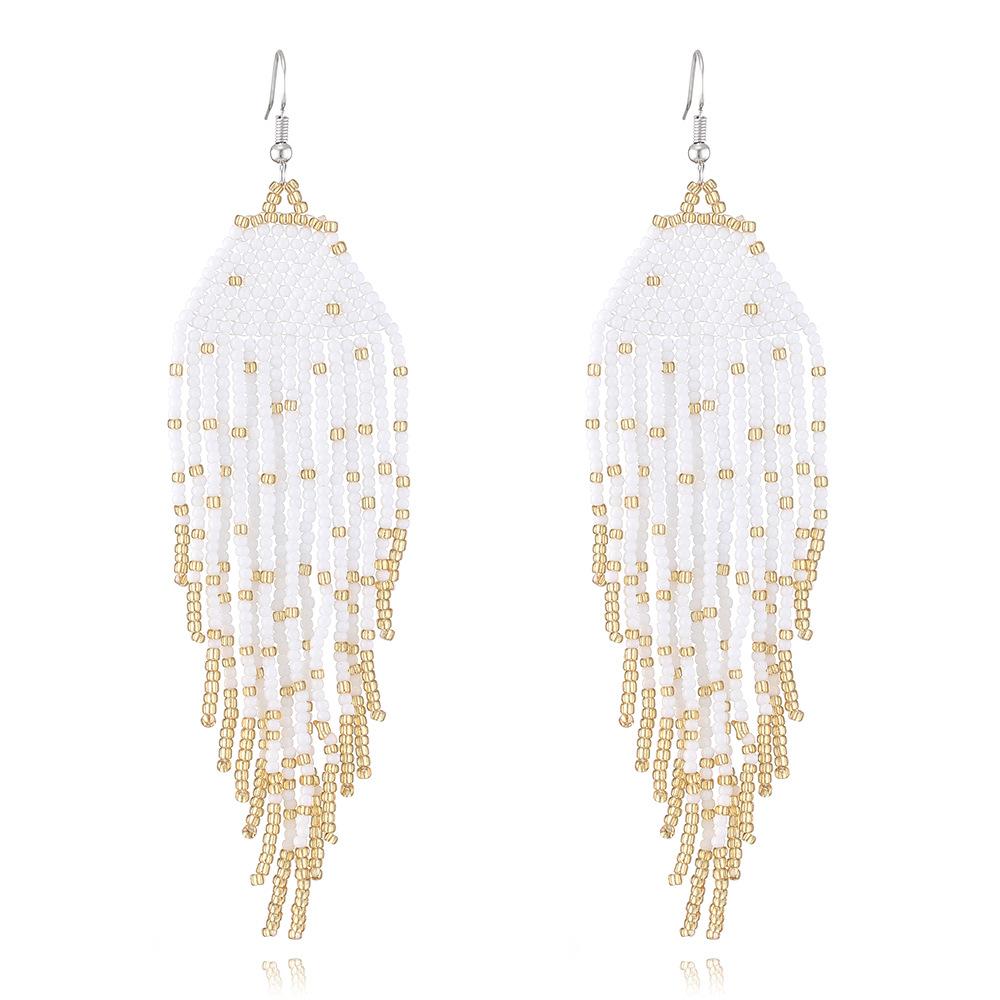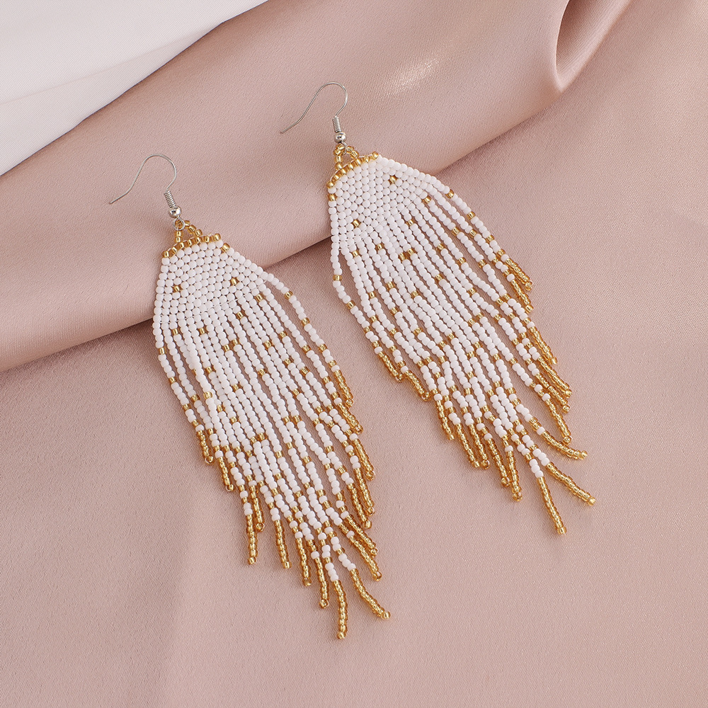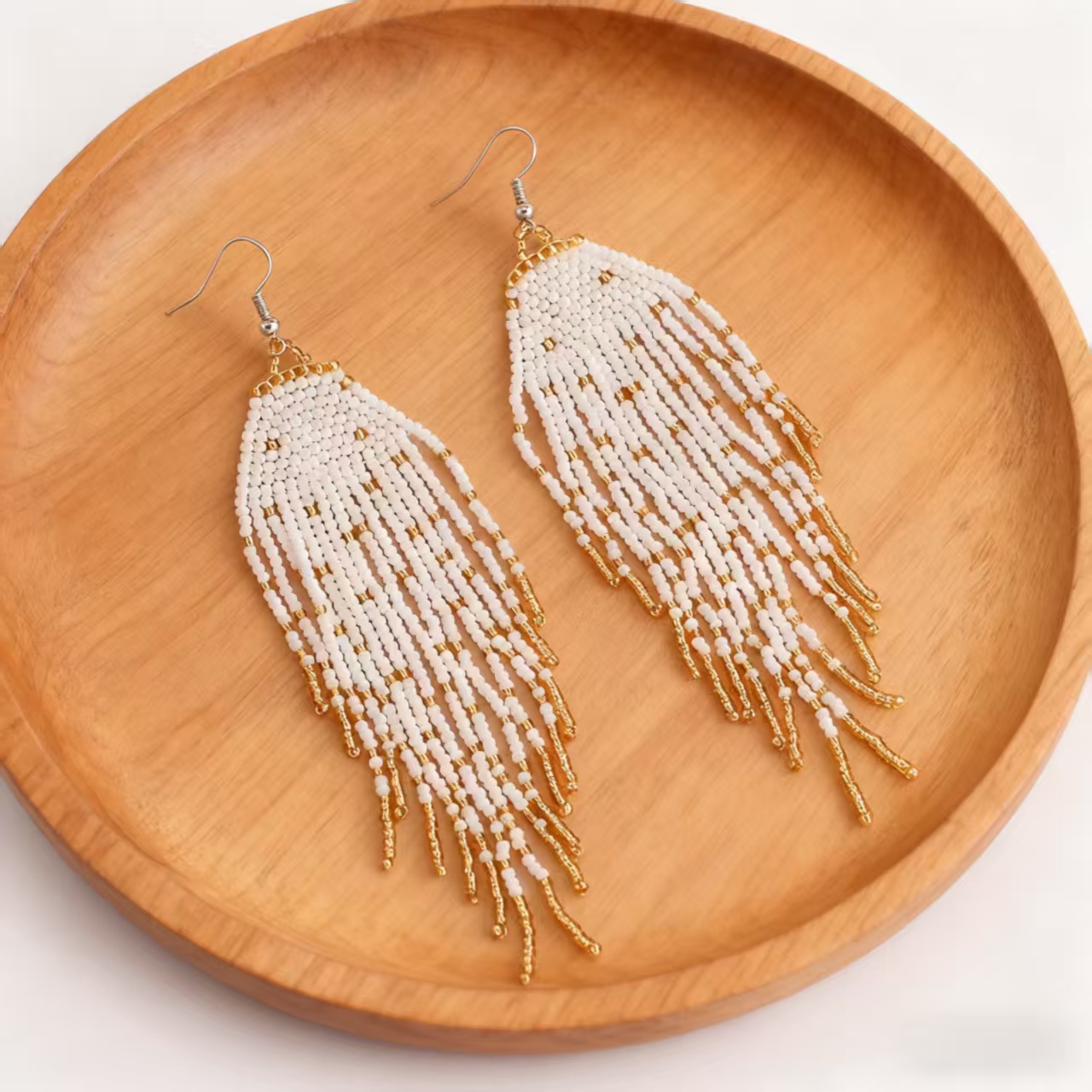 Absolutely in love with these earrings! They are beautifully crafted and have such an elegant, bohemian vibe. The white and gold beads catch the light perfectly. I've worn them to a summer party and received so many compliments. They are surprisingly lightweight and comfortable for all-day wear. Definitely my new favorite accessory!
