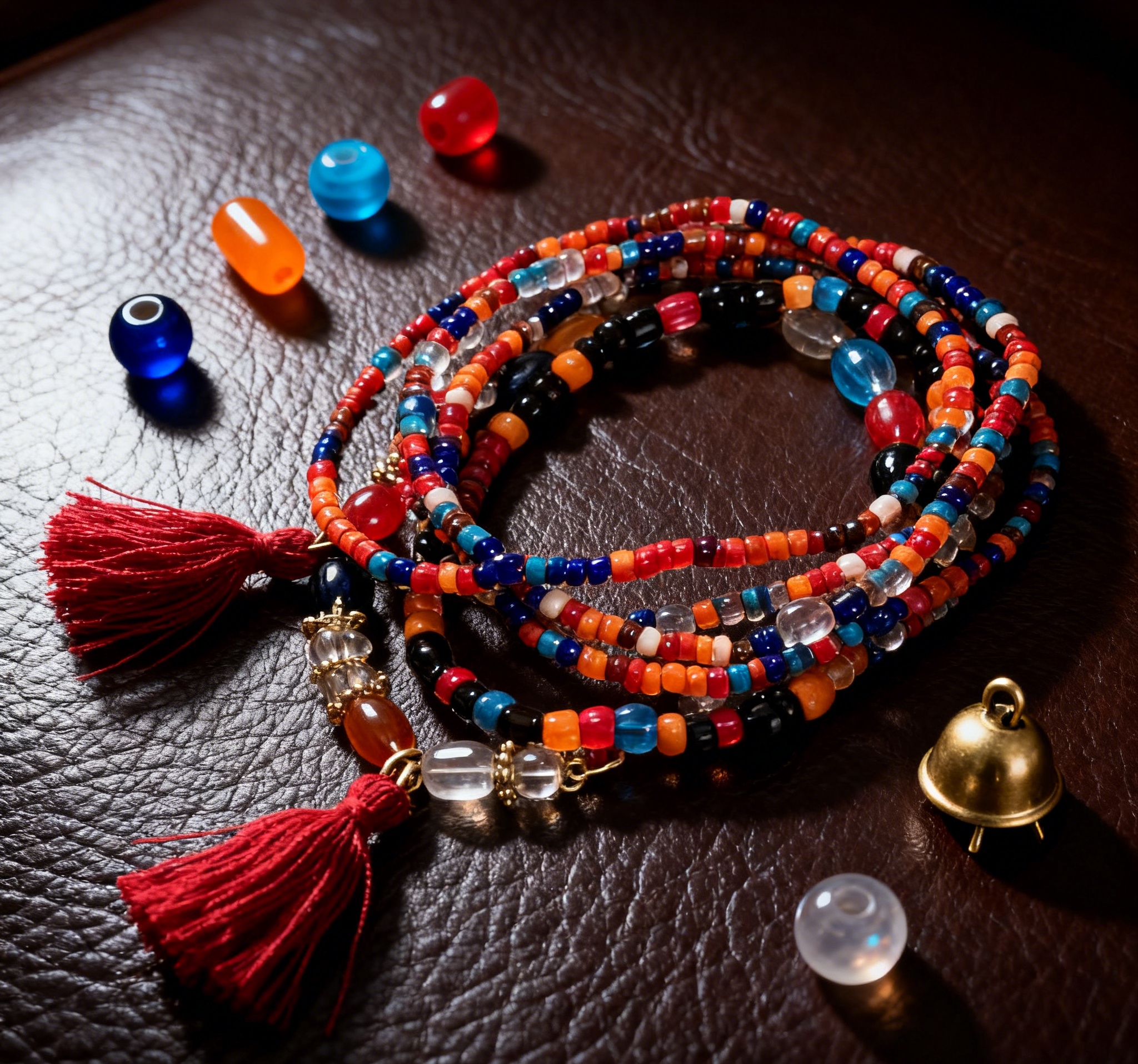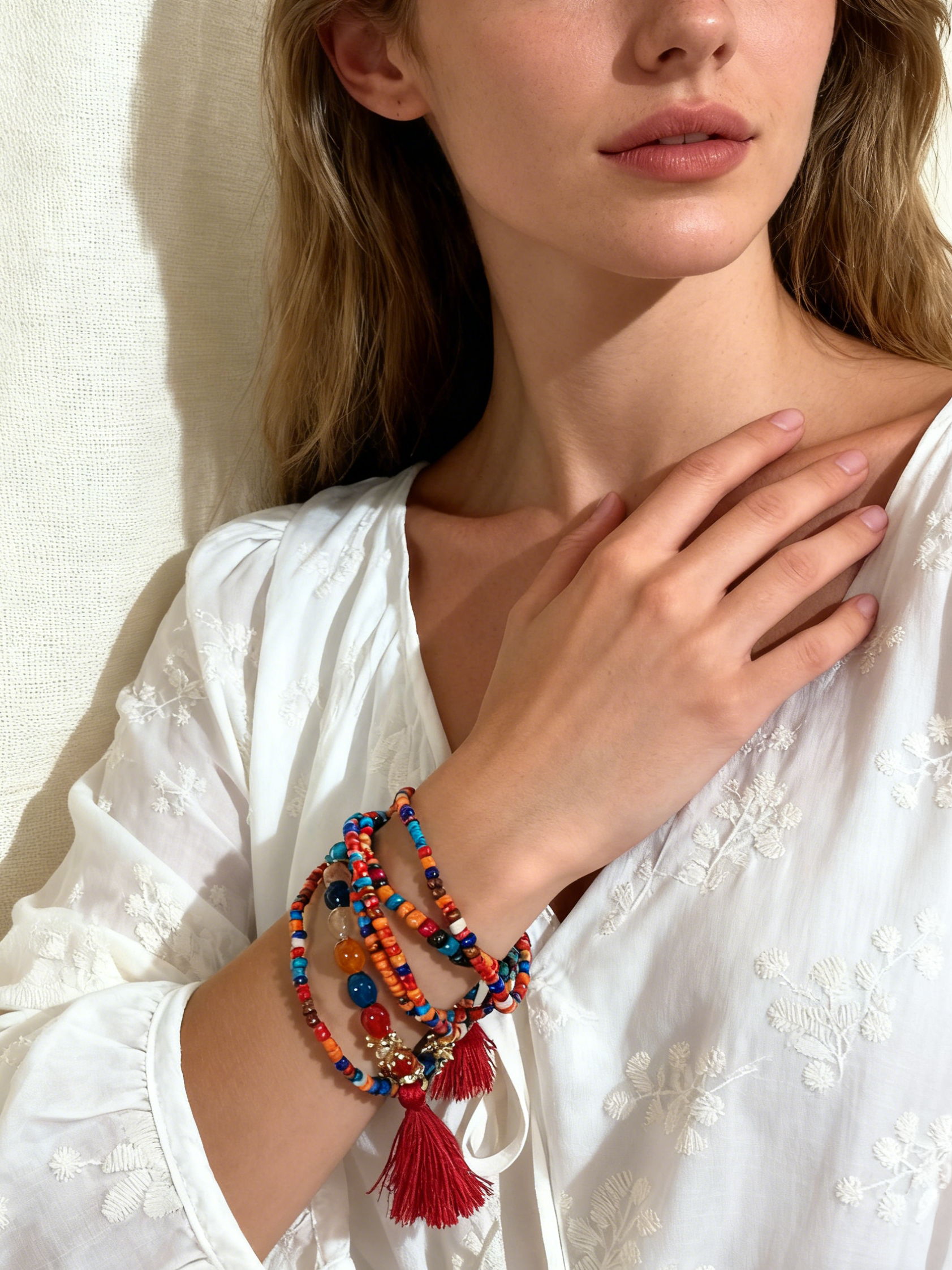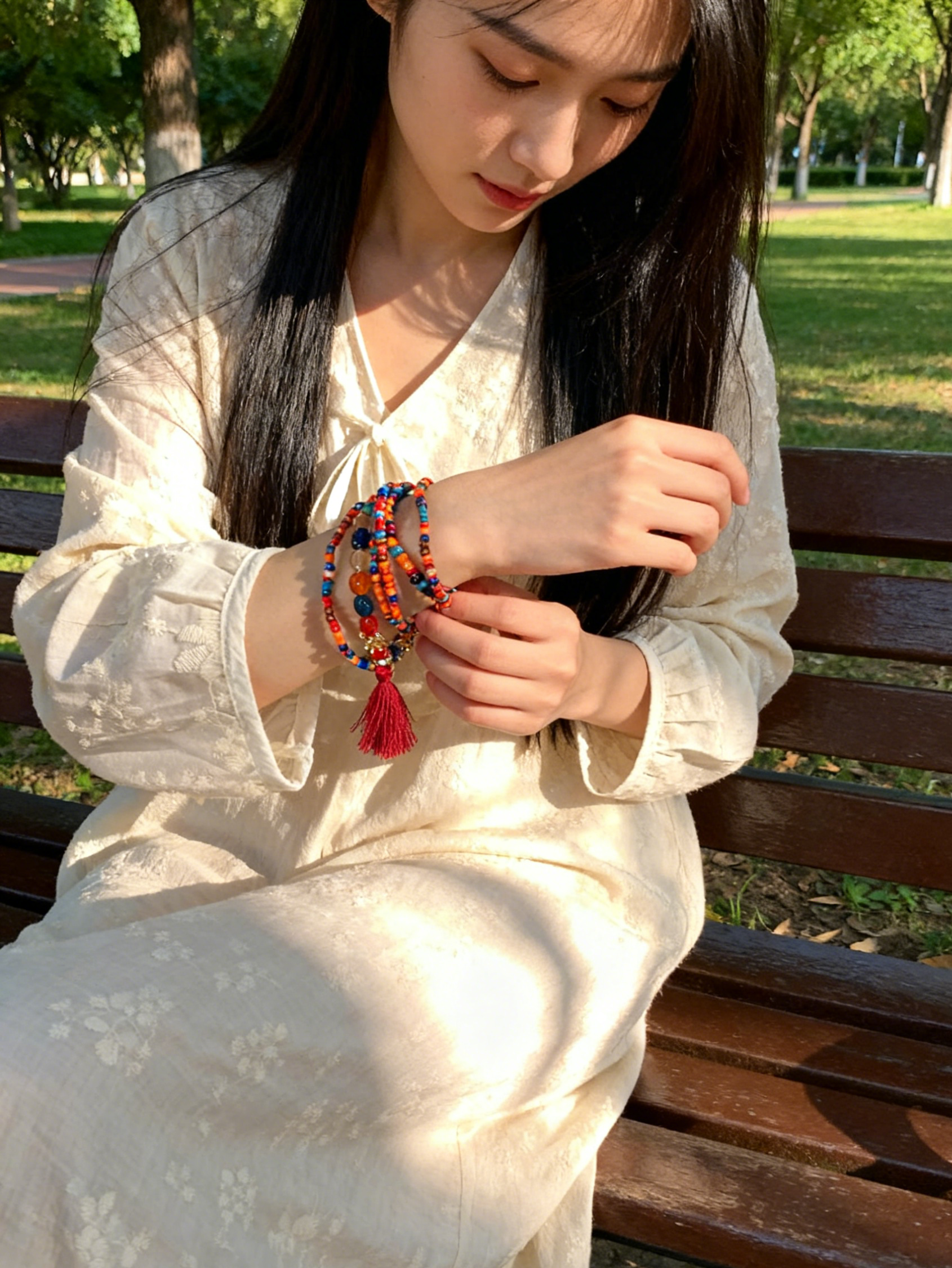 Inspired by the poetic wandering of Bohemia and the romantic strokes of poets, this bracelet features colorful beads like lines of free poetry, spreading a colorful narrative of wandering on the wrist; the passionate red tassels are like the rhymes of poetry, and every swing is a soulful ode to life. The hand-strung bead chain is a "wandering poem" written by craftsmen with ingenuity, condensing the Bohemian "romance, freedom, and poetic dwelling" on the wrist. It is not only an accessory but also a poetic carrier of the wandering soul, carrying the beautiful meaning of "wandering the world with poetry, and writing your own life chapter in the symphony of colors and tassels". May you, who wear it, be like a wandering poet, composing a poetic scroll unique to yourself with romance and freedom in life's journey.