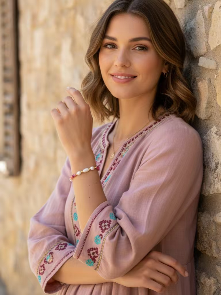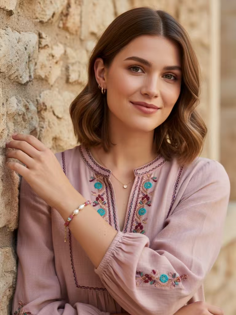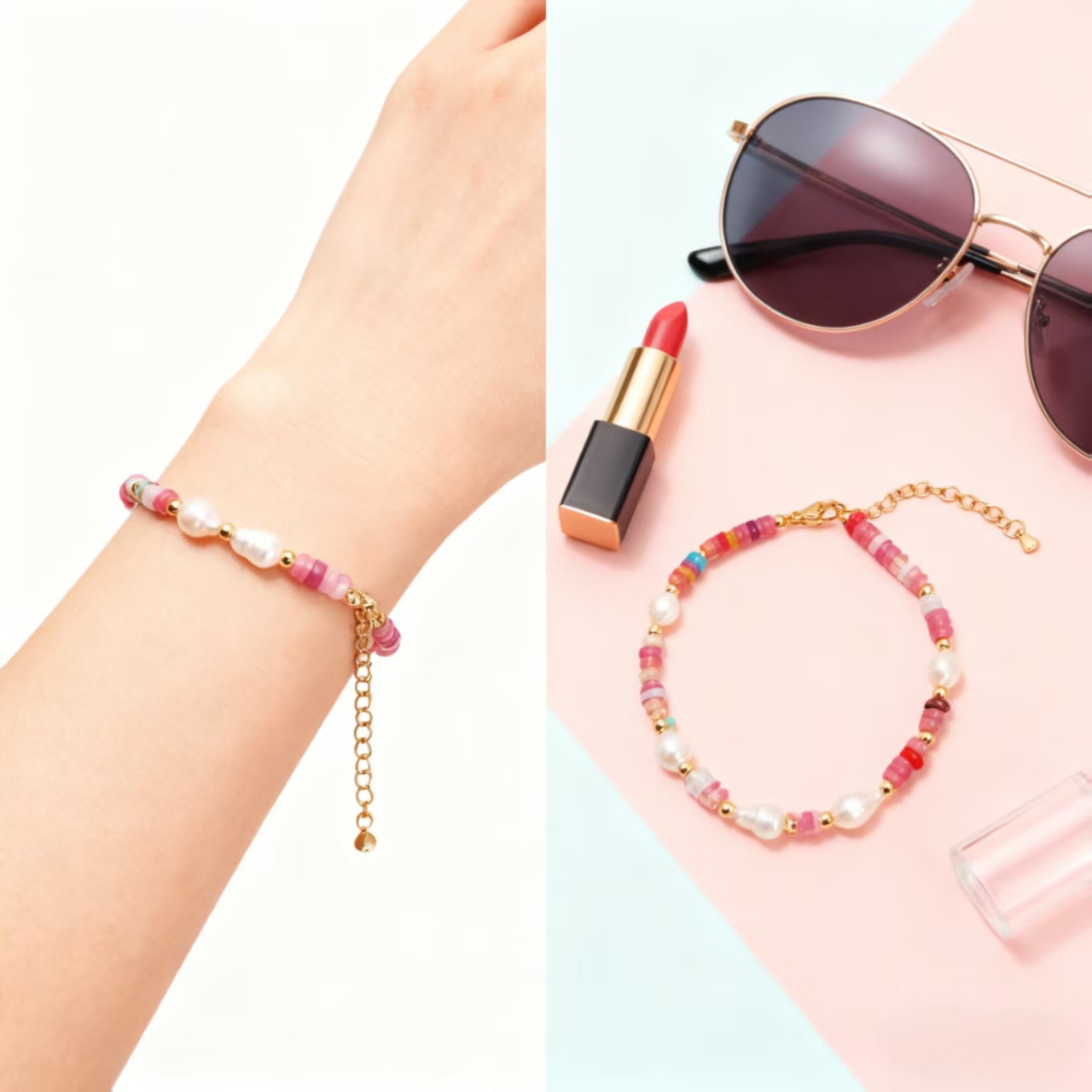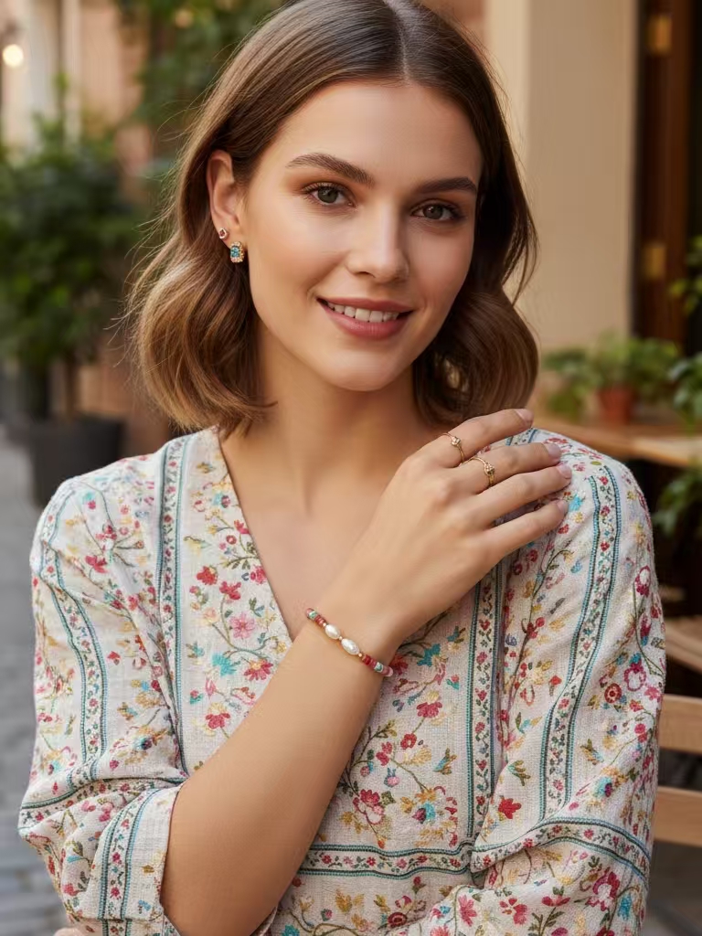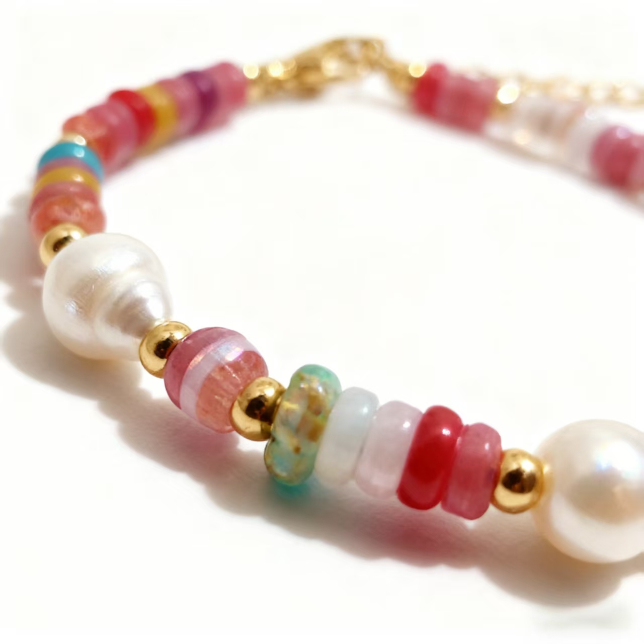 This bracelet captures the flowing colors of Adelaide silk from the Kashgar Bazaar, recreating the vibrant scenes of the Silk Road—from the crimson of the Flaming Mountains to the azure of Kanas Lake—with various natural tourmalines and agates. Baroque pearls, like scattered snowmelt from the Tianshan Mountains, add a gentle balance to the splendor. The bracelet carries the blessing of "abundance and purity," wishing the wearer a life as vibrant and abundant as Adelaide, and an inner world that always retains the clarity and radiance of pearls.