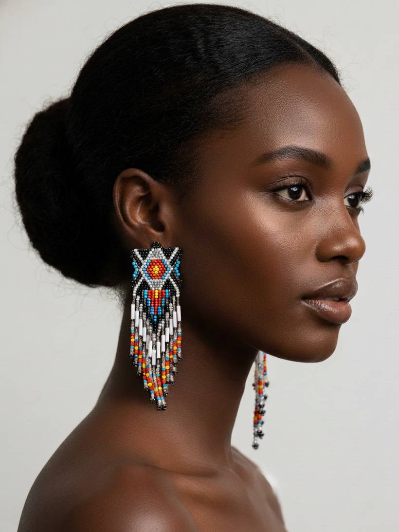 The design inspiration for this earring comes from the mysterious totem of the "Guardian's Eye" in ancient tribal legends. The diamond-shaped pattern at the center of the earring is formed by fiery red, orange, and yellow seed beads, like an eye that sees through everything, also symbolizing the sun, the source of life, burning with unceasing passion and wisdom. The sky-blue seed beads surrounding it represent the clear sky, while the black and white interwoven geometric lines represent the order of day and night's alternation, together weaving an indestructible protective barrier. The tassel below is strung together with pure white long beads and colorful short beads, like the tail feathers of a sacred eagle, conveying whispers and blessings from the wilderness with every sway. In tribal culture, the "Guardian's Eye" is the embodiment of power and wisdom, capable of dispelling confusion and guiding the way forward. Therefore, this earring carries the profound meaning of "guardianship and wisdom," may it become your amulet on your journey forward, granting you the foresight to discern truth and the courage to move forward fearlessly.