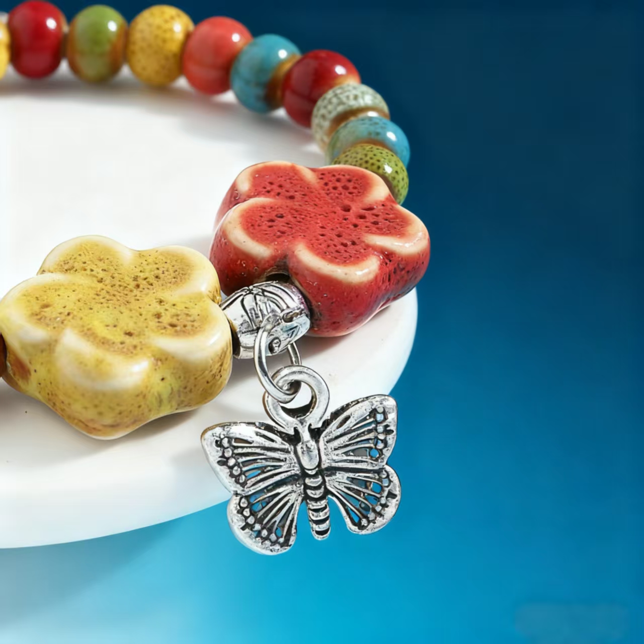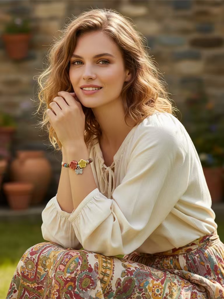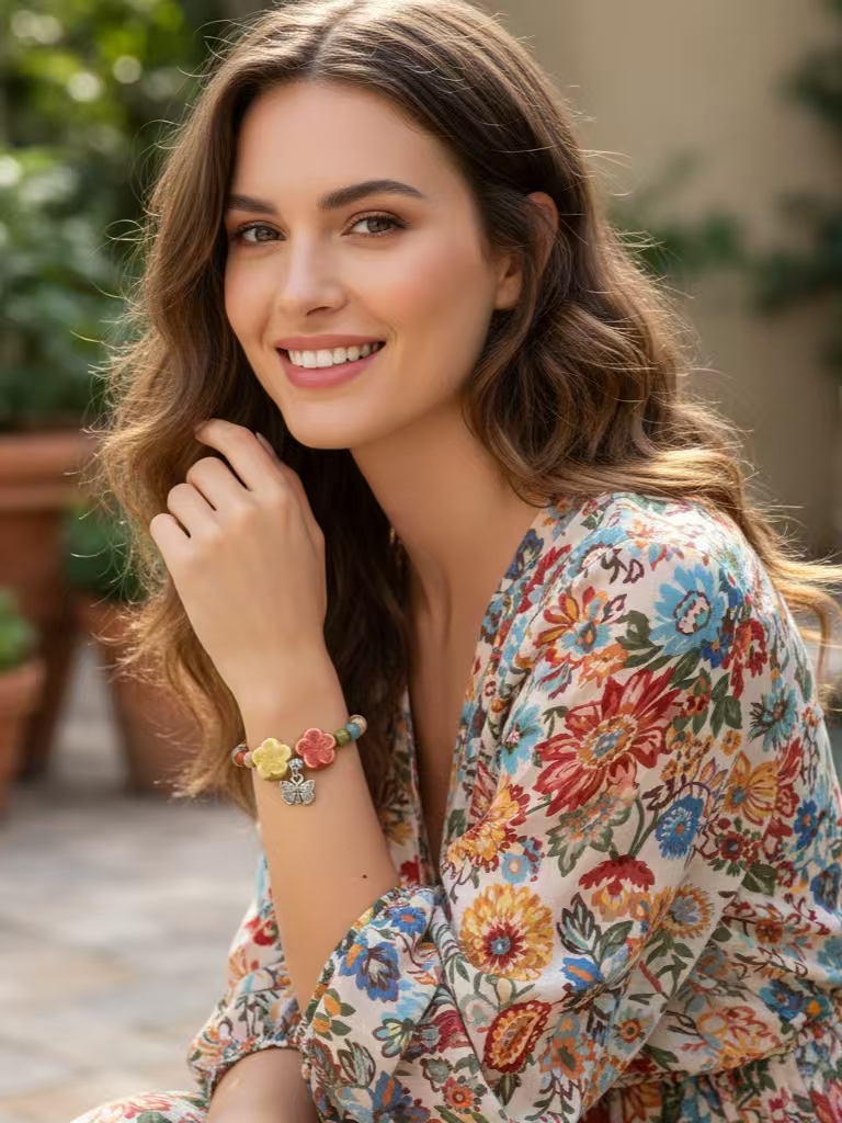 Inspired by the Yili River Valley after a rain shower—wildflowers bloom as vibrantly as Adelaide silk, and butterflies flutter like messengers of spring. We use ancient pottery techniques to blend the verdant green of the grasslands, the azure of the sky, and the crimson of the Flaming Mountains into ceramic beads, firing them to create warm, smooth beads with a crackled glaze. Adorned with flower and butterfly designs, these beads capture the message of spring. The bracelet carries the blessing of "joy and rebirth," wishing the wearer a life as vibrant as a spring day in Yili, a heart full of beauty, and free to blossom.