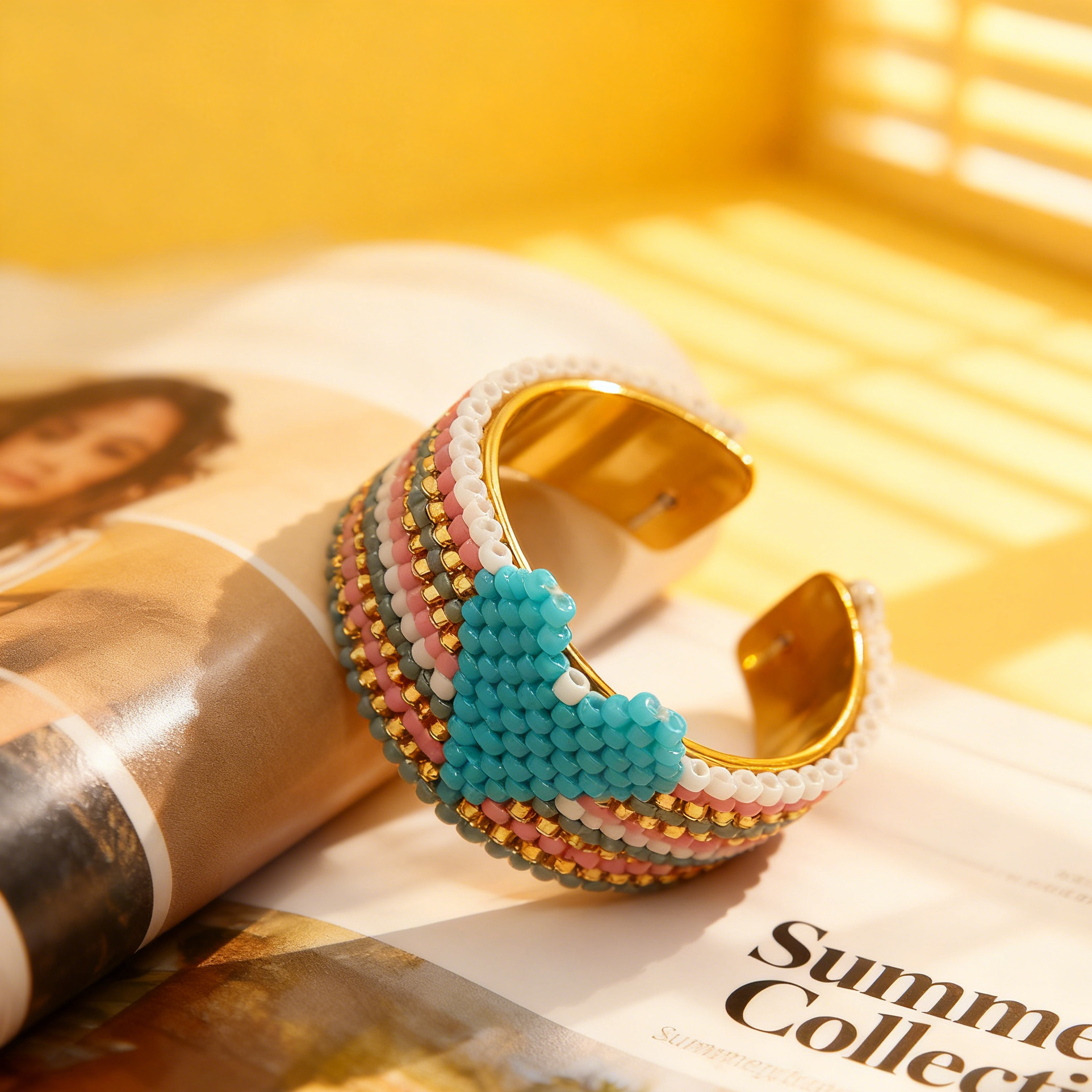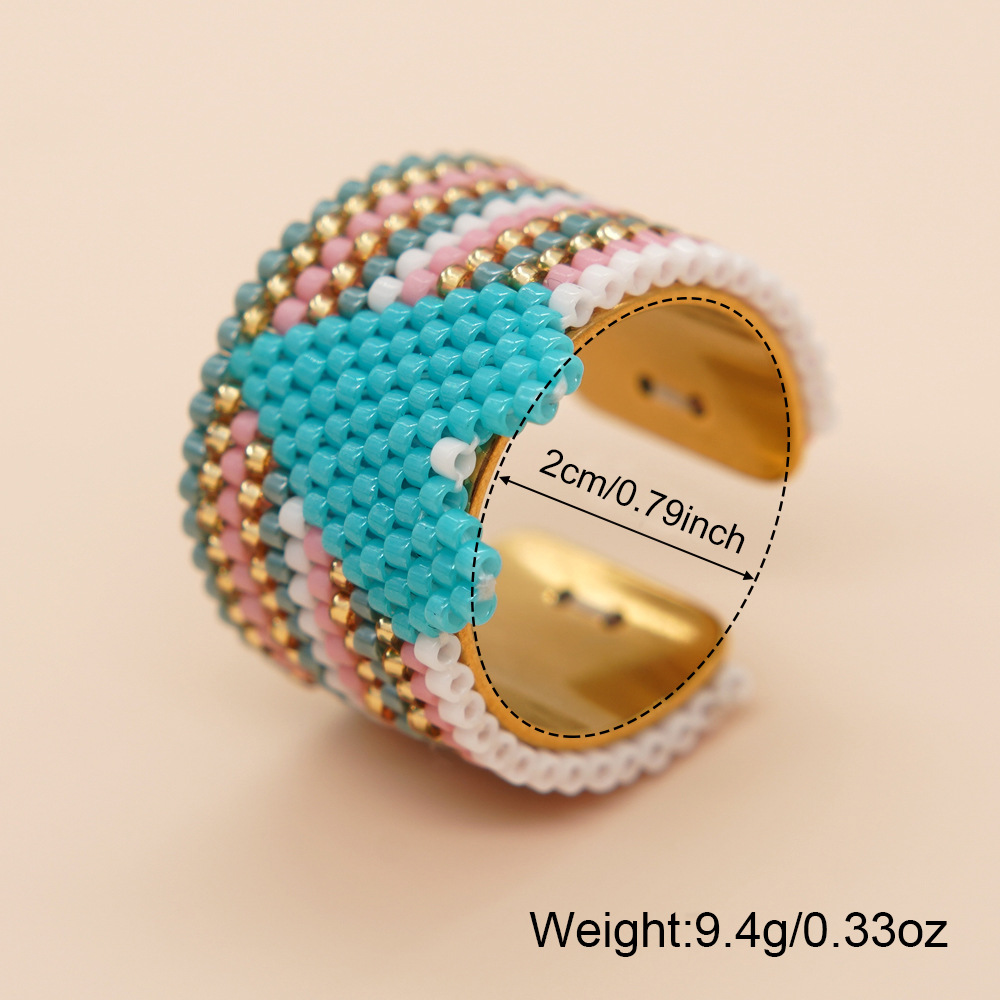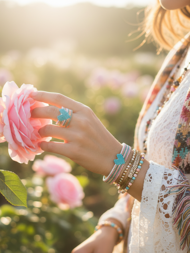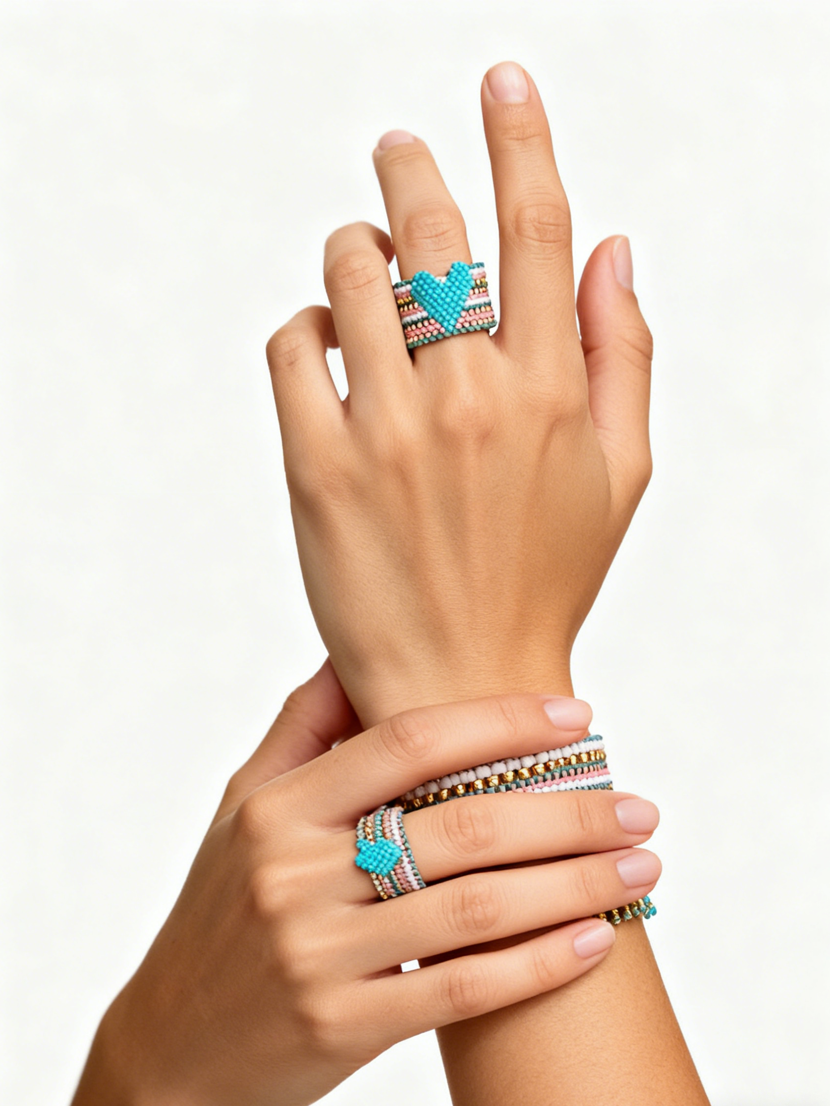 | The design inspiration for this ring comes from a mysterious atoll lagoon named 'Heart Sea' in South Pacific legends. At the center of the ring, a heart outlined by turquoise-colored seed beads is precisely that pure lake which only reveals itself to those with true love, symbolizing an unreserved true heart. The gentle dogwood pink and pure milky white seed beads intertwine, a romantic poem left behind when the sunset glow kisses the white sand beach. Golden and dark green seed beads interspersed throughout symbolize the swaying palms on the shore and the treasures hidden in the deep sea, together guarding this tranquility and beauty. Legend has it that when the tides resonate with heartbeats, this 'Heart Sea' will guide lovers to find each other. Therefore, this ring carries the beautiful promise of 'where the heart yearns, love returns,' may it become the compass on your finger, clearly pointing to your inner beloved and direction, no matter where you go. |