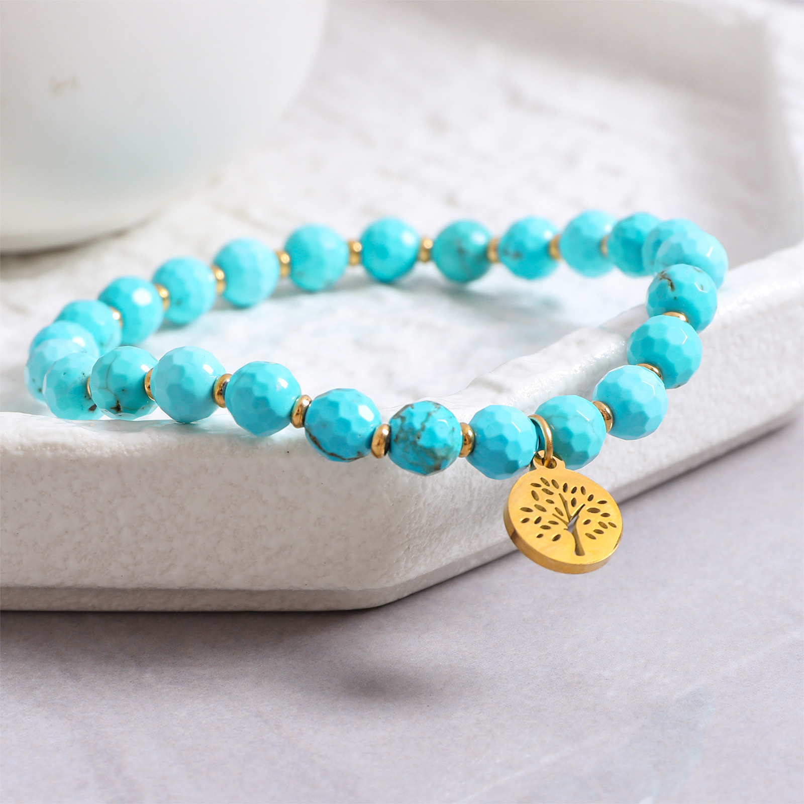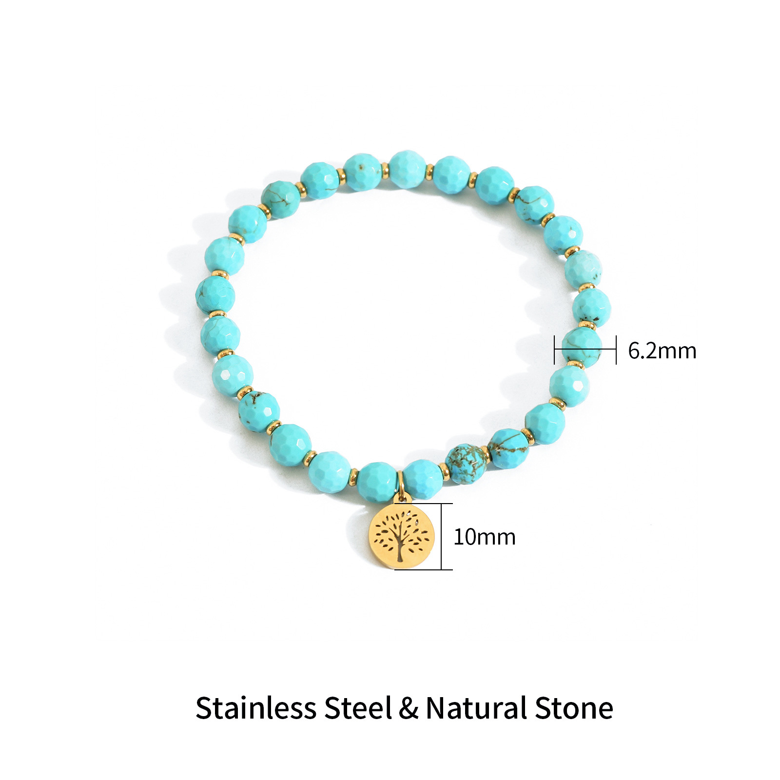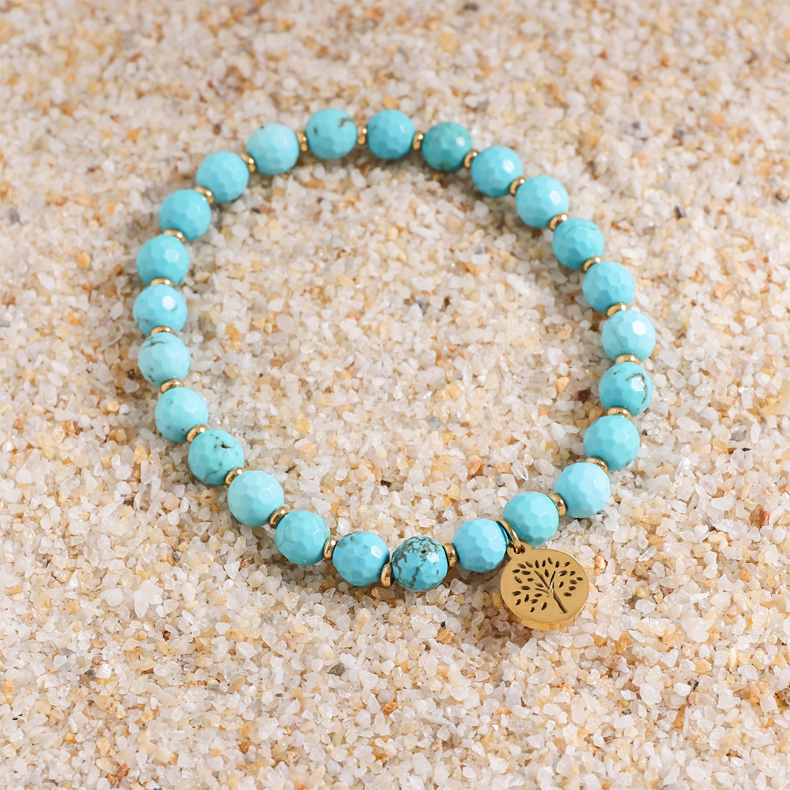 Inspired by Sayram Lake, known as "the last tear of the Atlantic." The design captures the shimmering surface of the lake with finely cut turquoise beads, while gilded round beads resemble scattered morning light. The dangling "Tree of Life" symbolizes the soul of the oasis nourished by the sacred lake. This bracelet carries the blessing of "healing and vitality," wishing the wearer a mind as clear as the lake—washing away weariness—and roots as deep as the Tree of Life, leading to growth, abundance, and joy.