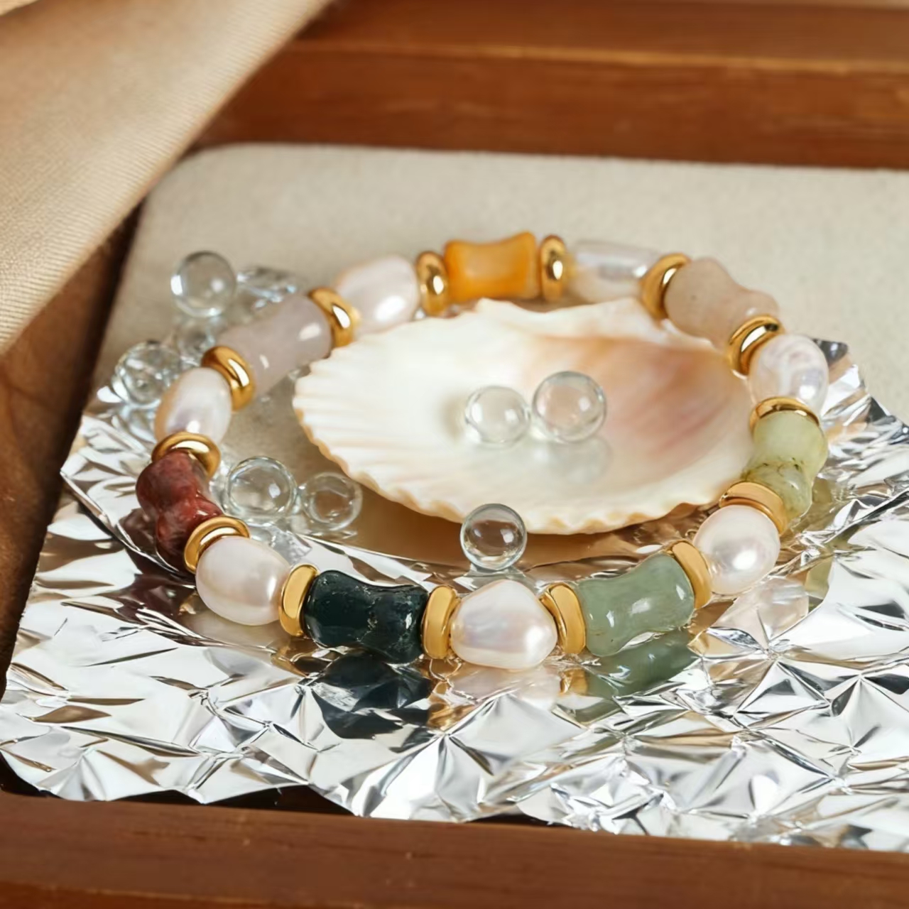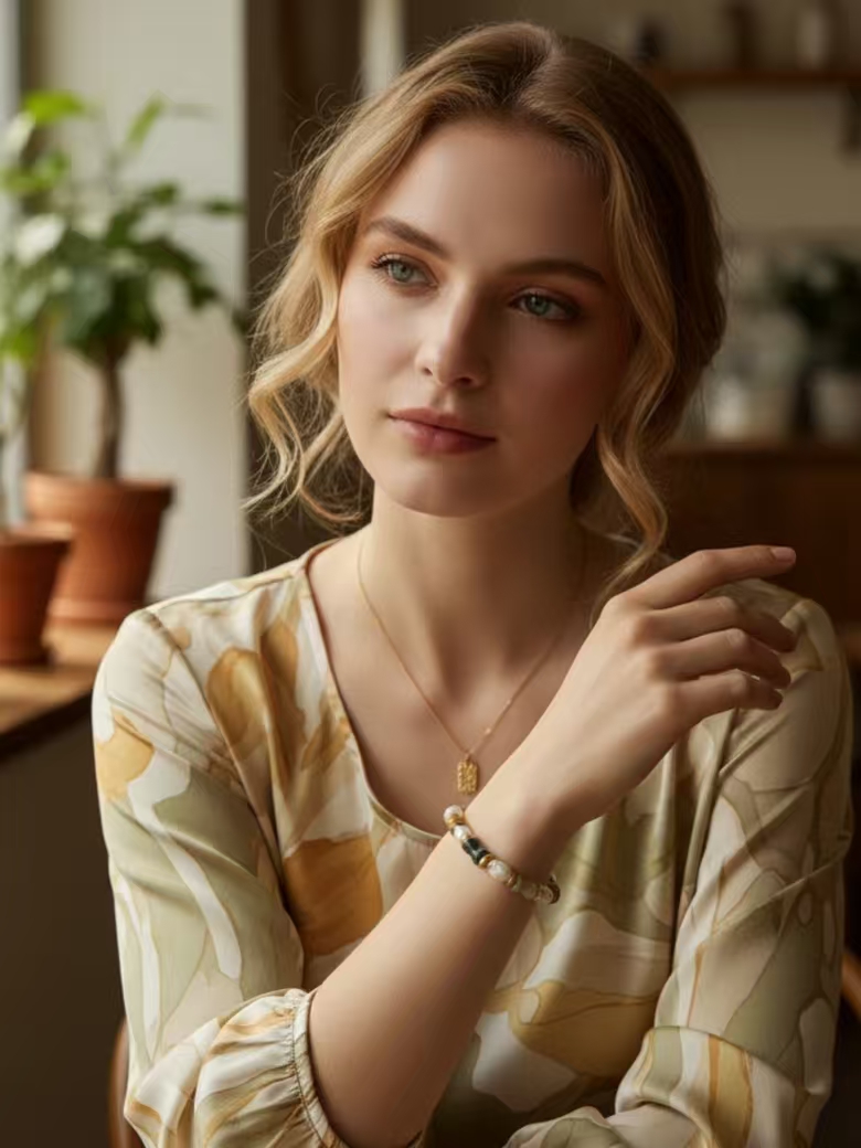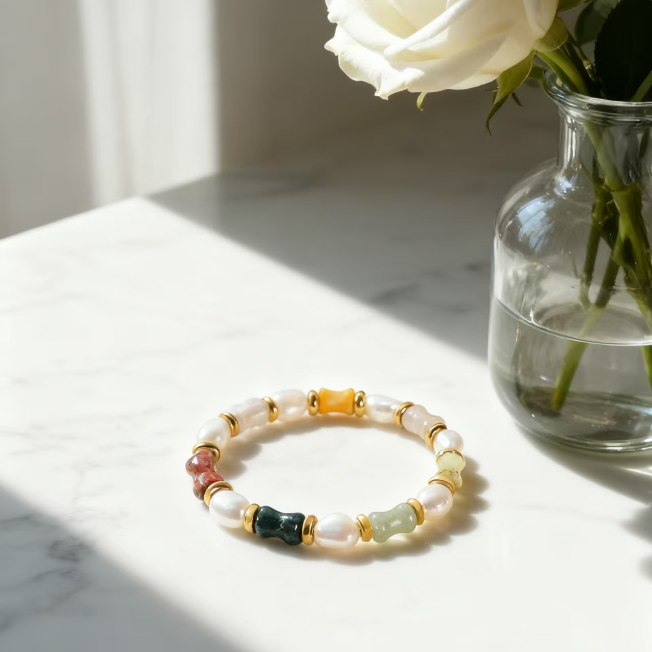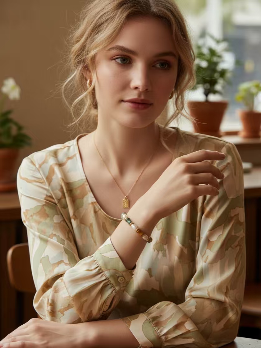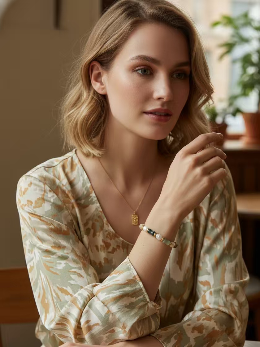 Inspired by the changing seasons of Xinjiang—the green of spring in Yili, the red of summer in the flames, the yellow of autumn in the poplars, and the white of winter in the Kunlun Mountains—this design is condensed into a bamboo-like shape crafted from natural colored jade, symbolizing growth and resilience. The baroque pearls strung throughout, like moonlight connecting the seasons, lend the overall piece a flowing gentleness. The bracelet carries the blessing of "composure and abundance," wishing the wearer to grow as resilient as bamboo, calmly facing the seasons of life, and reaping fulfillment and abundance in the passage of time.
