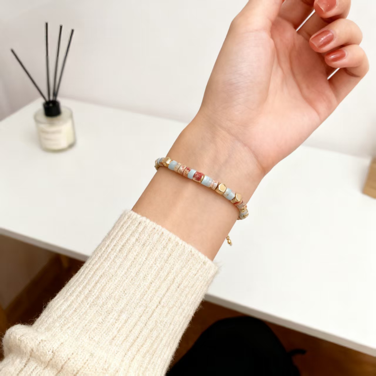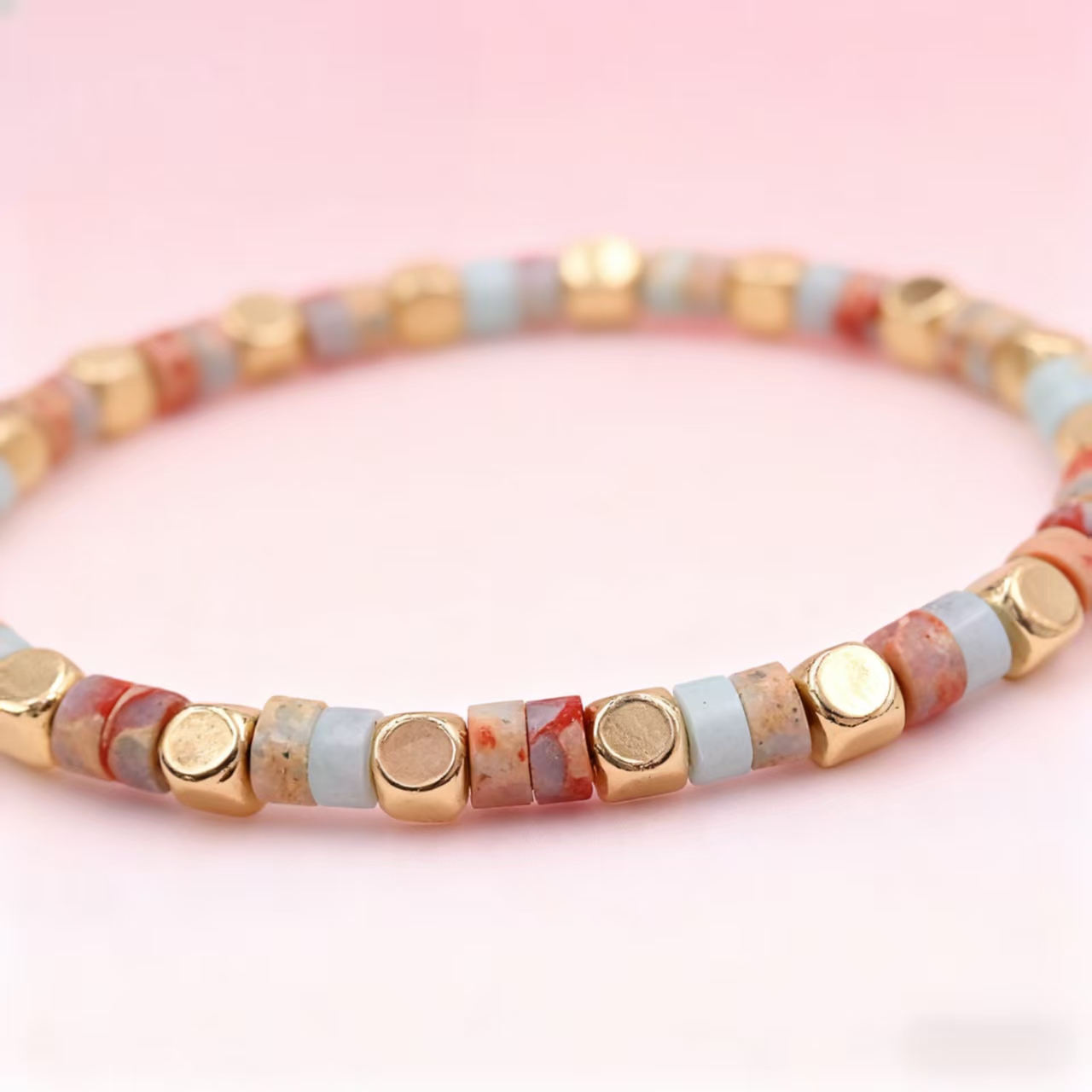 The design is inspired by the mottled colors formed on the ancient city walls of Kashgar over time — ochre red and sand white reflect the natural color of rammed earth, pale blue resembles faded murals, and shimmering gold evokes the afterglow of the Silk Road. The bracelet uses multicolored emperor stone to replicate the texture of wind-eroded landscapes and flaking paint, while the pale blue aquamarine symbolizes the hope growing on this land, and the gold-plated square beads represent the sacred sunset etched onto the earth. It carries blessings of 'tranquility and strength,' wishing the wearer to be steadfast and resilient like the Yadan sanctuary, and to cultivate a unique radiance through the passage of time.